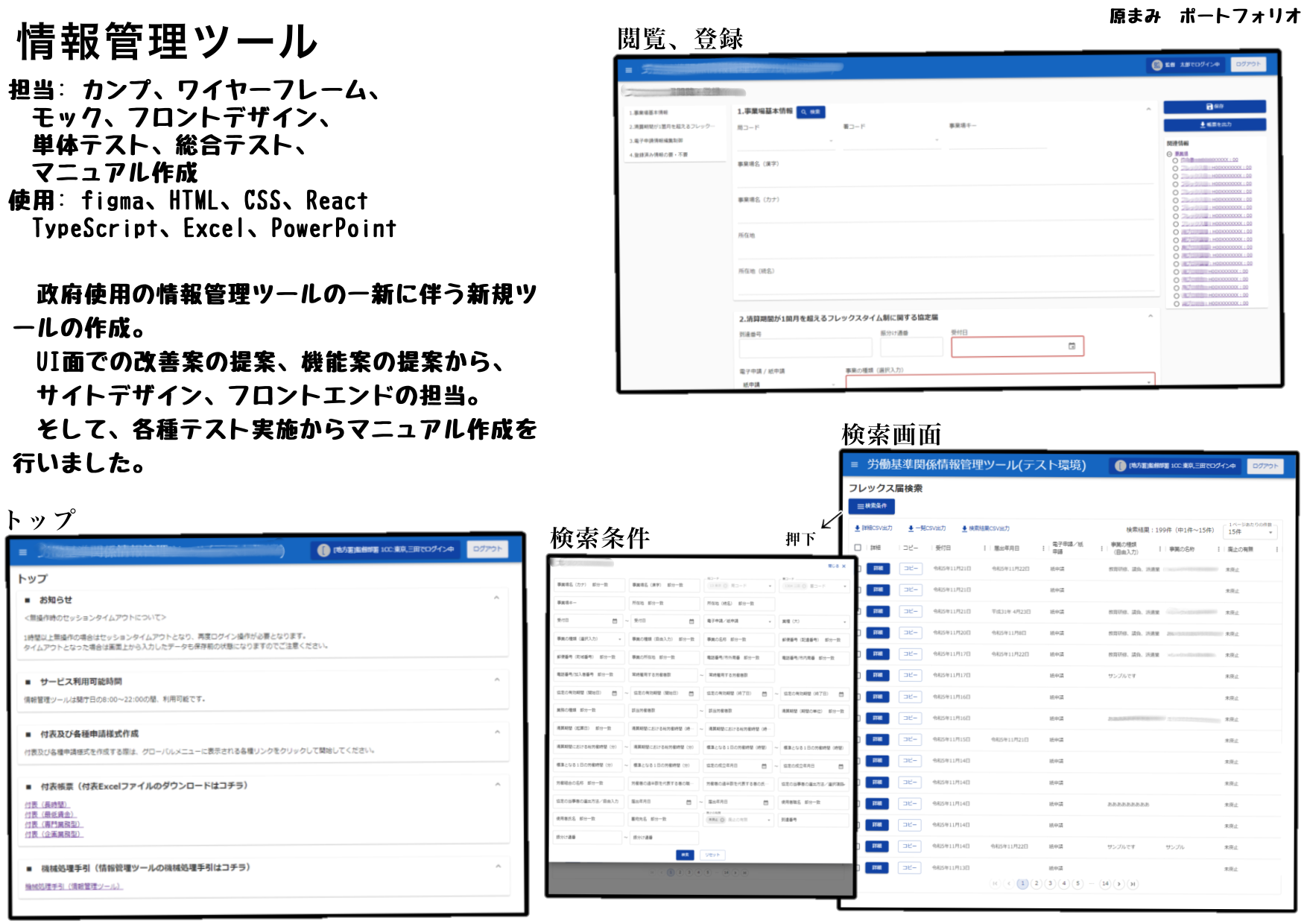 - HTML、JavaScript、React(マテリアルUI)、TypeScript、figma、Excel、PowerPoint