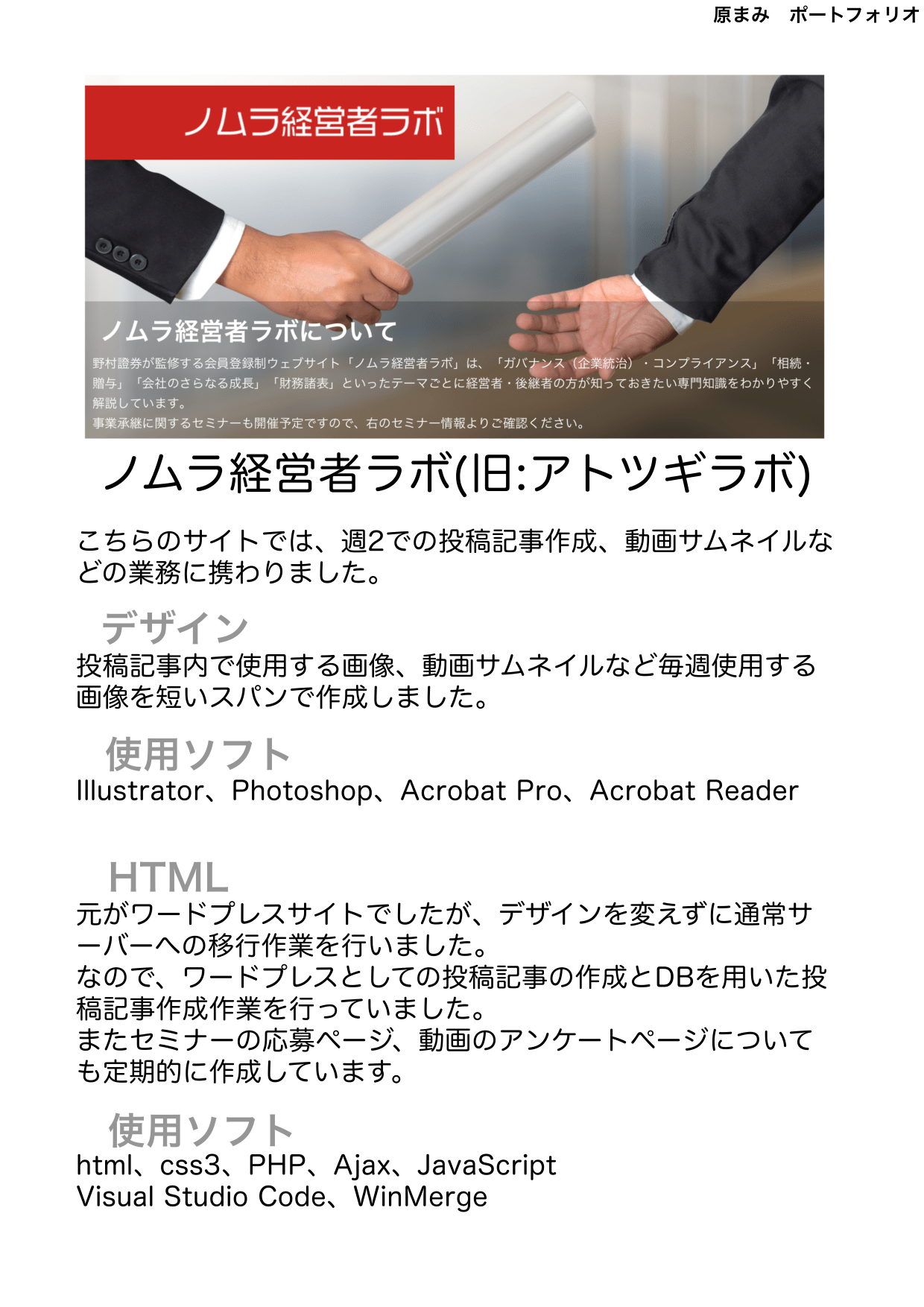 - HTML、JavaScript、PHP、Photoshop、Illustrator、AdobeDC pro